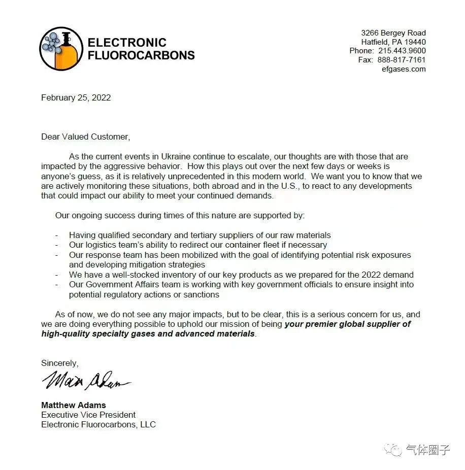 2月26日,美國(guó)電子特氣公司EFC發(fā)布聲明:公司已經(jīng)為2022年準(zhǔn)備了充足的全年庫(kù)存,而且擁有合格的第二和第三材料供應(yīng)商。